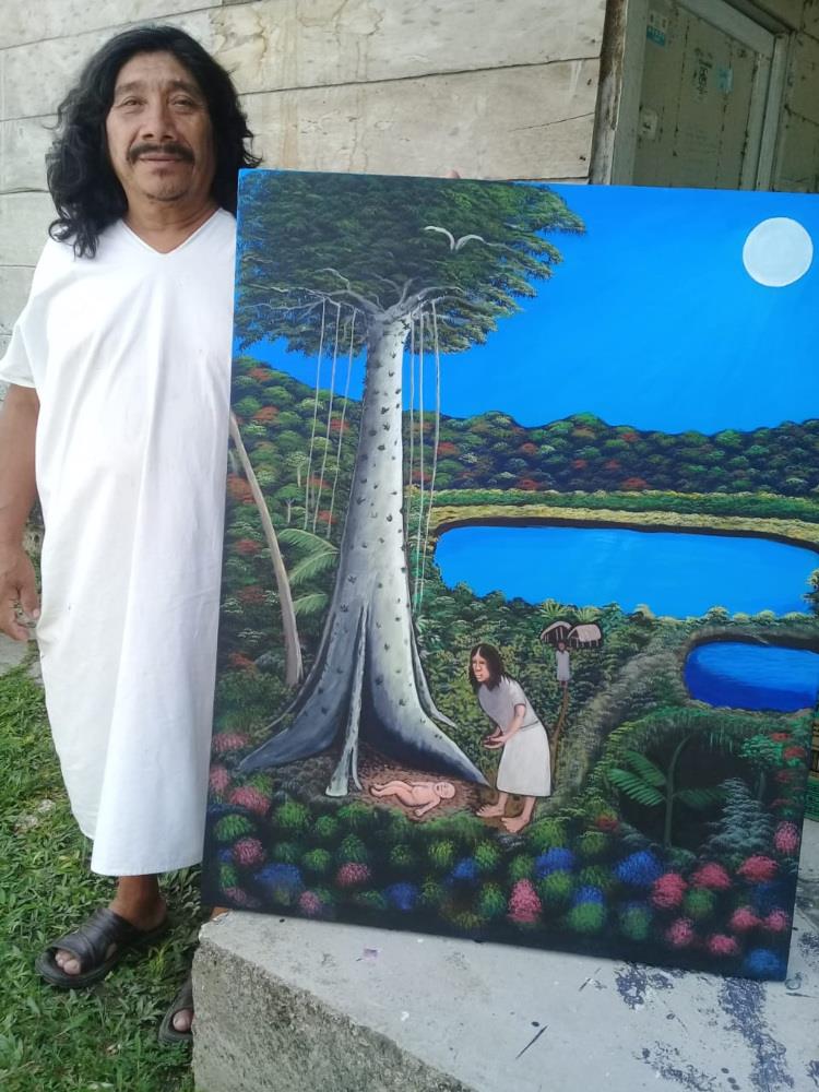 Kayúm Ma’ax, Maya/Lacandón artist, was born in Naha, Ocosingo, Chiapas, Mexico, in 1962. A self-taught artist awarded the Chiapas Prize in 1992. He paints with an eye trained since birth in the jungle environment, and an unprecedented narrative ability informed by the worldview and local history of Nahá (a population of 250 people) that has only been “open to the world” for about 50 years. Learn more.