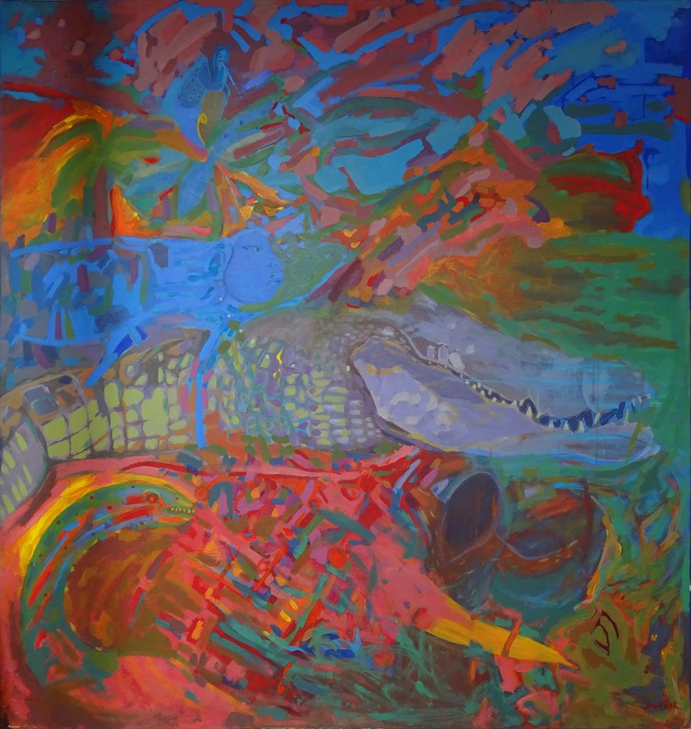 “Esta pintura representa la inundación de un pueblo. Los zoques de Tecpatán tenían problemas con un grupo de personas de otra comunidad conocido como “los colorados” (porque venían pintados de rojo). Los colorados tenían poderes sobrenaturales: se convertían en animales. Dentro de las comunidades zoques también unos tenían poderes: había curanderos, hombres sabios, que adquirían formas de animales (sus ko´jama) para pelear.” Sigue abajo.